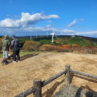 ここは遮るものが何もないので伊勢湾の大展望であり、風車群がたくさん見えた。 若いカップルや仔犬を連れたご夫婦がみえた。 |