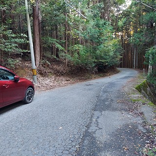 かなり下ってくると、左写真の法面の上に3等三角点 点名「奥山」があるようだ。 旧道に車を停めて取り付きを探して戻る。 |