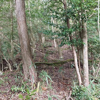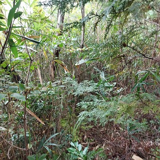 左写真のように道は殆どなく適当に進む。 獣道のようでもある。 途中、右方向に向きを変えるとブッシュの薮となり、いつまで続くのだろうと突進すると、30mほどで多少開けて下写真のようになる。 |