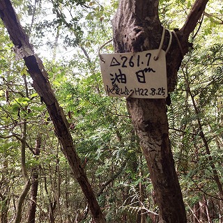 しばらくすると、左写真の標柱が見え3等三角点があった。 点名「油日」である。 |