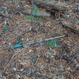 | 最初は笹藪だが、その後雑木となってくる。 ストックが1本落ちていた。帰りに拾おうと思っていたのだが、帰りにはもう少し東寄りに下りた。 MASTERSと書かれていた。 |