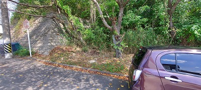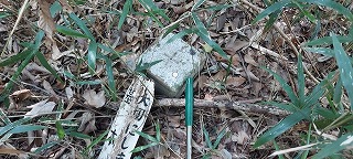 続いて点名「石神」 住宅地の最も高そうな所にあった。 左写真の所から茂みに入る。 |