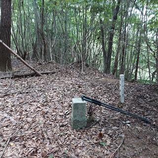 三角点を過ぎた辺りで右の山道を戻り気味に上がると標柱と三角点が見えてきた。 |