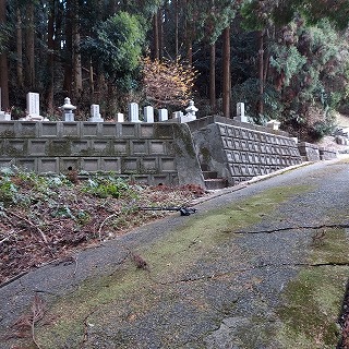 医王寺の手前に墓地があり、その手前から左折して山道を行く。 ここがおそらく地図の実線の林道だと思うが、現在は荒れ放題であった。 |