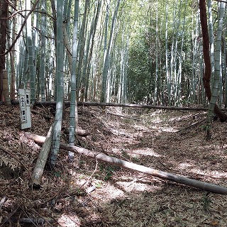 藪の中を歩いて来ると藪の中のわずかなスペースに4等三角点 「市部」があった。 三角点付近はイバラが多かった。 この南は植林だった。 ピストンでもどった。 |