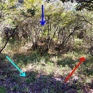 上写真より50mほどくると分岐があった。 行きには赤。帰りは水色 水色のピストンの方が楽だと思う。 三角点は青↓あたりだ。 |