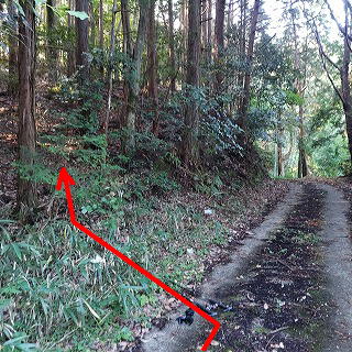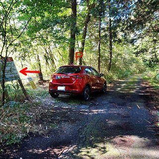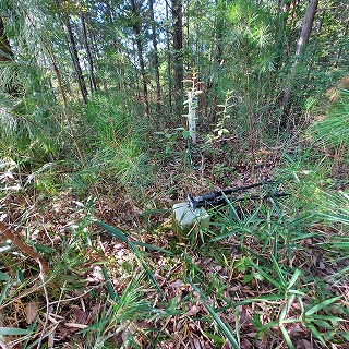 本日4番目に点名「打越」を目指す。 林道の入口に駐車し、林道を南東に歩く。 左に脇道があり進んで行くと、すぐに道が消えてしまう。左の高みを目指す。 |