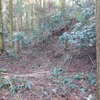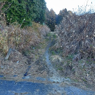 荒れた林道が道なりに右カーブする所の茂みから入山する。 |