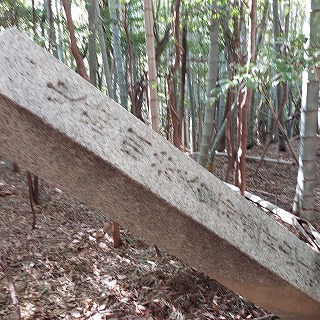 するとフェンスから離れ、次のピークには、左写真の碑が倒れかかっていた。 史蹟明治天皇神? 裏には昭和12年8月19日?と彫られていた。 |