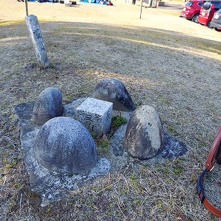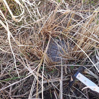 | 枯れ草をどかすと、コンクリートの正方形の枠が現れ、三角点の+が見えた。 | ![]() |