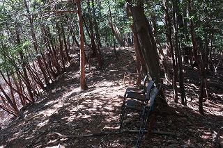 | 尾根上には右写真の様に古いベンチが設置されていた。 右写真以外にもいくつかの場所であった。 ハイキングコースにでもしようとしたのかしら。 |