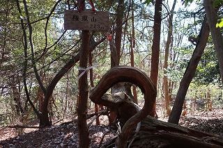権現山から左に向きを変え幅広の尾根を緩やかに下って鞍部に着く。 三角点はすぐ前のこんもりした所にあった。 |