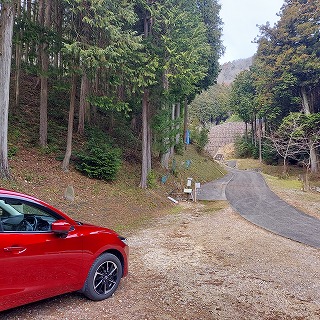 国道21号「柏原東」の交差点を北へ。すぐ先に踏切があり、それを越えてすぐ右折。 鳥居の所で左折して山へ向かう。 左写真まで車で上がり、5台ほどの駐車スペースに駐車。 |