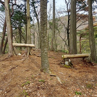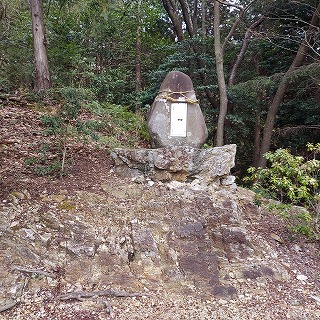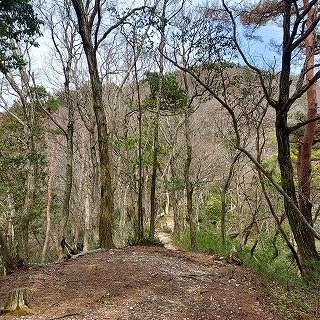 | すぐ先には城址「長比城跡」があった。 ここから東に下る山道があった。 こちらは、なだらかなつづら折れの道であった。よく整備されていた。 |